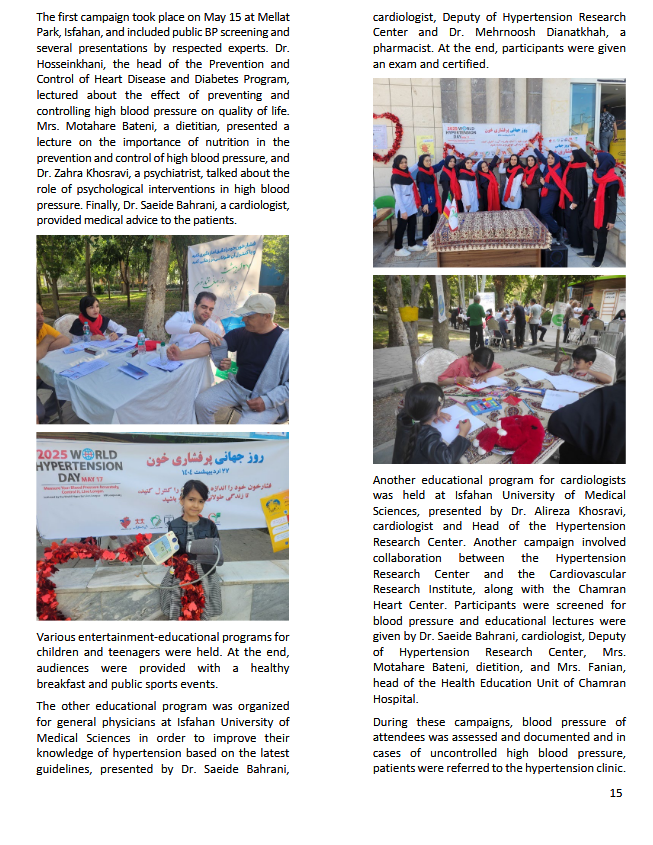 در پی برگزاری موفقیتآمیز روز جهانی پرفشاری خون در تاریخ ۱۷ می ۲۰۲۵ (مصادف با ۲۷ اردیبهشت ۱۴۰۴)، خبرنامه ماه سپتامبر لیگ جهانی فشارخون (WHL) گزارشی جامع از اقدامات و دستاوردهای این روز را منتشر کرد که بخش ویژهای از آن به فعالیتهای مرکز تحقیقات پرفشاری خون و مرکز تحقیقات قلب و عروق پژوهشکده قلب و عروق دانشگاه علوم پزشکی اصفهان اختصاص یافت.